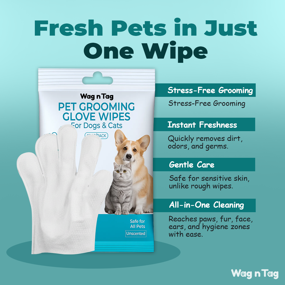 Wag N Tag Pet Grooming Glove Wipes make grooming simple and stress-free. Designed for easy cleaning with a glove fit, they let you wipe paws, fur, and delicate areas with comfort and control. Infused with aloe vera and tea tree extract, they soothe skin, reduce odors, and keep your pets fresh anytime, anywhere.